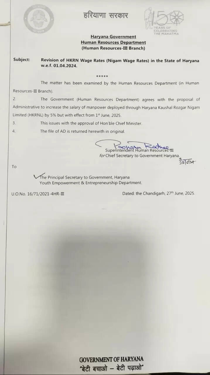 जानकारी के मुताबिक, अब कर्मचारियों की सैलरी में 900 रुपए से लेकर करीब 1200 रुपए तक की बढ़ोतरी होगी। इसे लेकर मानव संसाधन विभाग ने लेटर जारी किया है। ये आदेश 1 जून से लागू होंगे। Haryana
