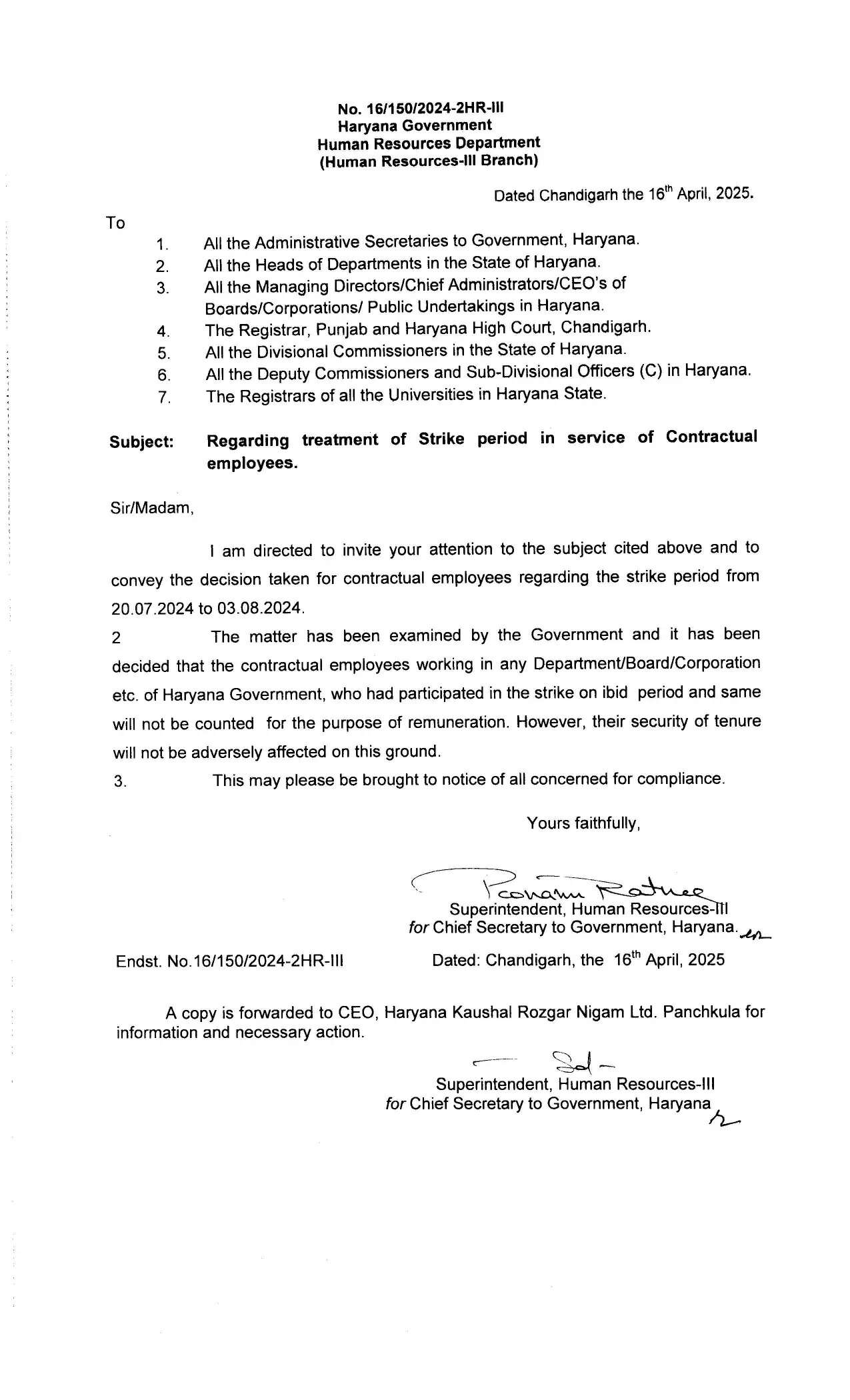 मानव संसाधन विभाग ने एक निर्देश जारी कर स्पष्ट किया है कि हड़ताल के दिनों के लिए ऐसे कर्मचारियों के कार्यकाल पर कोई प्रतिकूल प्रभाव नहीं पड़ेगा, लेकिन इन दिनों के लिए कोई पारिश्रमिक नहीं दिया जाएगा।