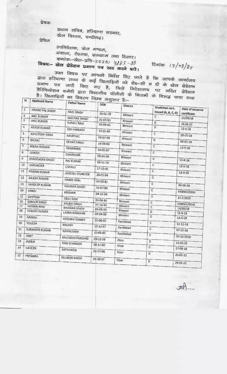 Haryana: हरियाणा से बड़ी खबर सामने आ रही है। हरियाणा के अंबाला, रोहतक, ग्ररूग्राम और हिसार जिले के खेल मण्डल के उपनिदेशकों ने अपने- अपने जिले के कई खिलाड़ियों को ग्रेड-सी व डी के खेल ग्रेडेशन प्रमाण पत्र जारी किए गए थे।