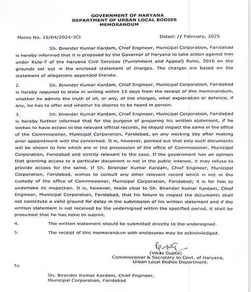 मिली जानकारी के अनुसार, 1 दिसंबर 2020 को बीके कर्दम ने करनाल नगर निगम से ट्रांसफर होकर फरीदाबाद नगर निगम का कार्यभार संभाला था।
