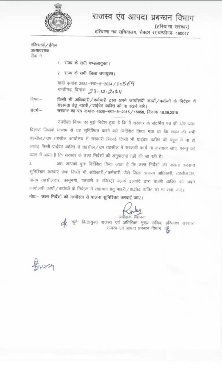 Haryana: हरियाणा से बड़ी खबर सामने आ रही है, हरियाणा के सरकारी दफ्तरों में अलग अलग महकमों के कर्मचारी और अधिकारी निजी स्टाफ रखते हैं, इसको लेकर अब हरियाणा सरकार ने सख्ती दिखानी शुरु कर दी है। रेवेन्यू डिपार्टमेंट की तऱफ ये अब निजी स्टाफ को लेकर आदेश जारी कर दिये गए हैं। अक्सर देखने में आता है कि पटवारी और कानूनगो अपने साथ निजी स्टाफ रखते हैं जिसको लेकर अब विभाग ने सख्ती दिखाई है।
