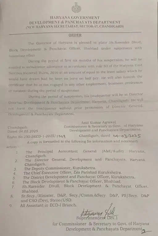 Haryana: हरियाणा में महिला सरपंच को रात में बुलाने वाला अधिकारी सस्पेंड, शिकायत के बाद विभाग का बड़ा एक्शन