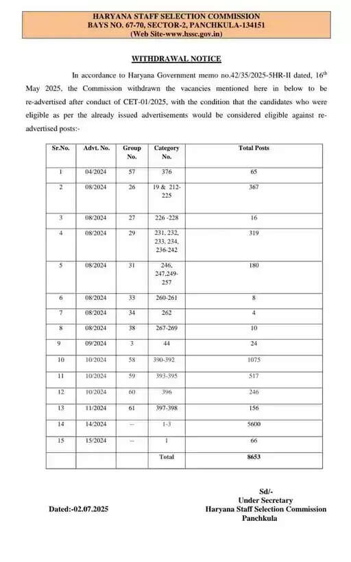 मिली जानकारी के अनुसार, इस नोटिफिकेशन में लिखा है कि हरियाणा सरकार की ओर से 16 मई को जारी आदेश के अनुसार इन भर्तियों के विज्ञापन को वापस लिया गया है। CET-2025 के एग्जाम के बाद इन भर्तियों को लेकर दोबारा विज्ञापन जारी किया जाएगा। Haryana Breaking News
