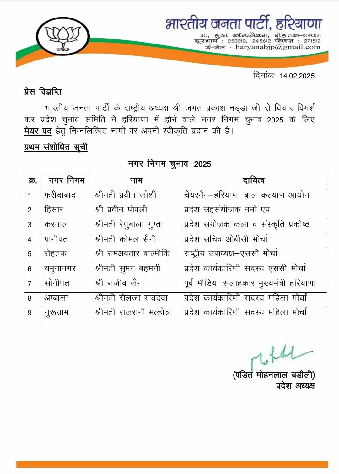 Haryana : हरियाणा में BJP ने जारी की मेयर प्रत्याशियों की लिस्ट, देखें उम्मीदवारों के नाम