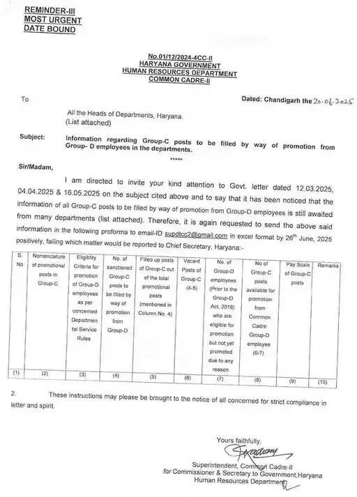 इस लेटर में स्पष्ट कहा गया है कि कई विभाग अभी तक ग्रुप-C के उन पदों की जानकारी नहीं दे पाए हैं, जो ग्रुप-D कर्मचारियों की प्रमोशन से भरे जाने हैं। सभी विभागों को निर्देश दिया गया है कि तय प्रोफार्मा में एक्सेल फॉर्मेट में जानकारी supdtcc2@gmail.com पर 26 जून 2025 तक अनिवार्य रूप से भेजें। ऐसा न करने पर मामला मुख्य सचिव अनुराग रस्तोगी को रिपोर्ट किया जाएगा।Haryana news