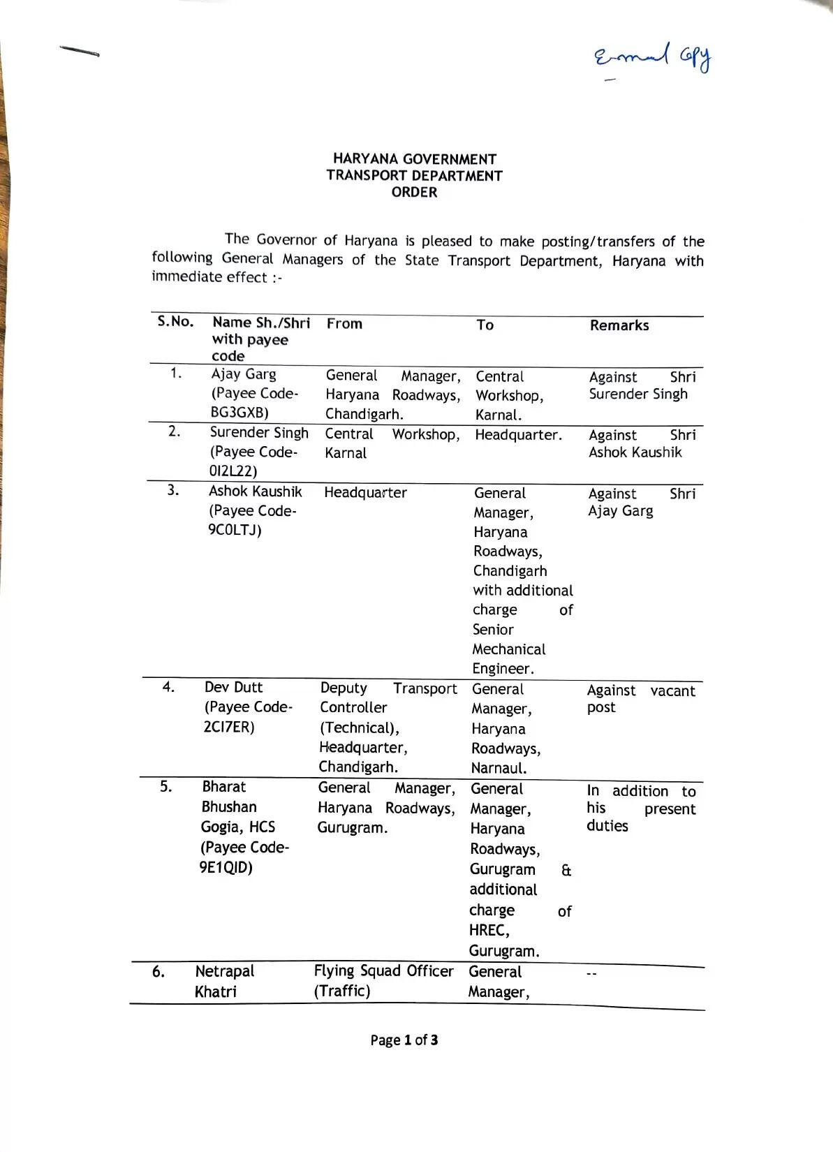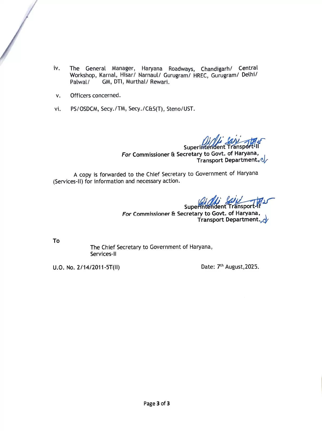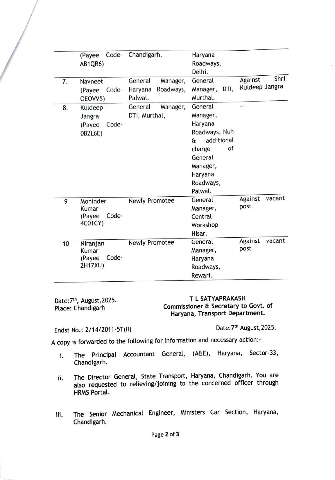 Haryana news : हरियाणा रोडवेज विभाग के लिए बड़ी खबर सामने आई है । रोडवेज विभाग में बड़े स्तर पर अधिकारियों के तबादले किये गये हैं । यहाँ देखें पूरी लिस्ट