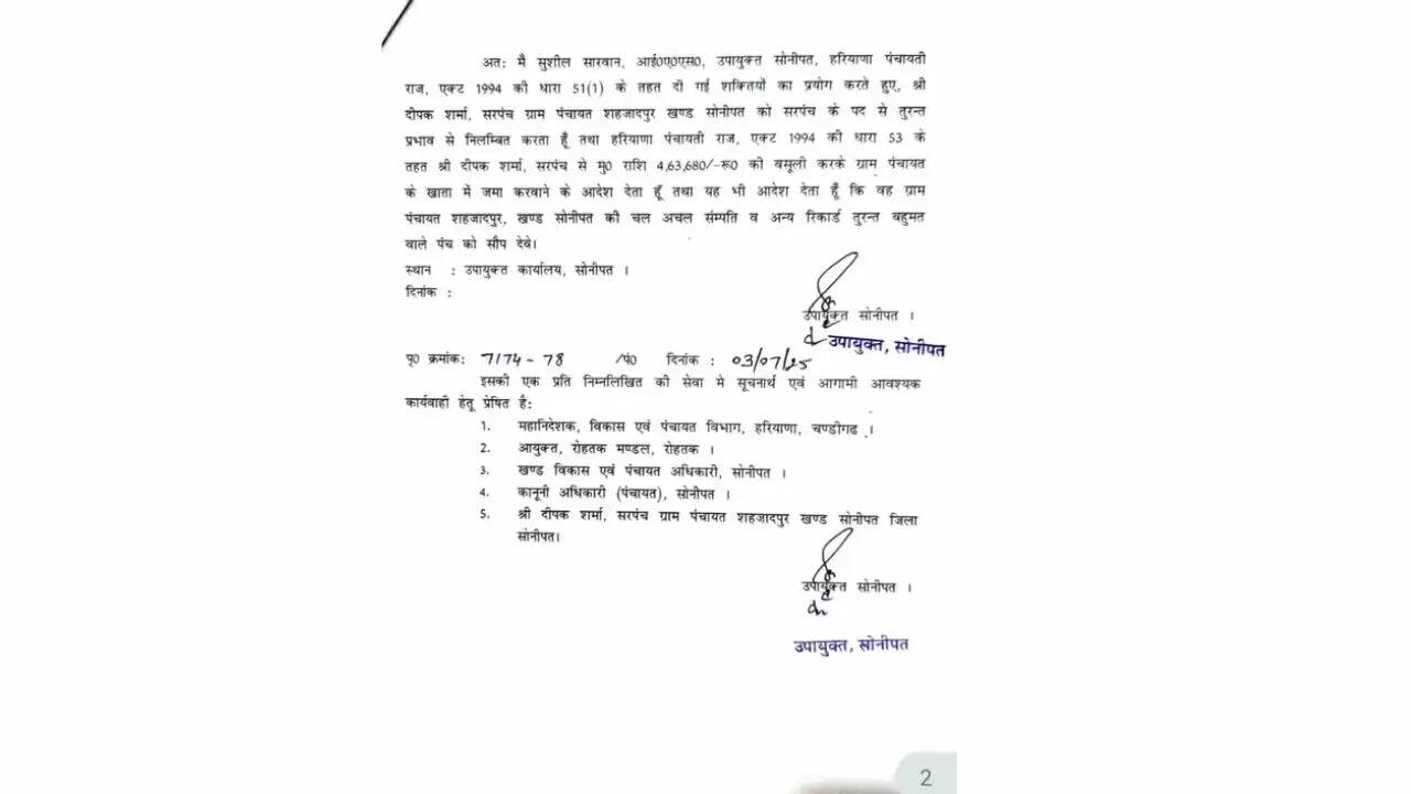 Haryana news : हरियाणा से बड़ी खबर सामने आई है। हरियाणा में सोनीपत के डीसी ने ग्राम पंचायत शहजादपुर के सरपंच दीपक शर्मा को गबन करने के चलते तत्काल प्रभाव से सस्पेंड कर दिया है।