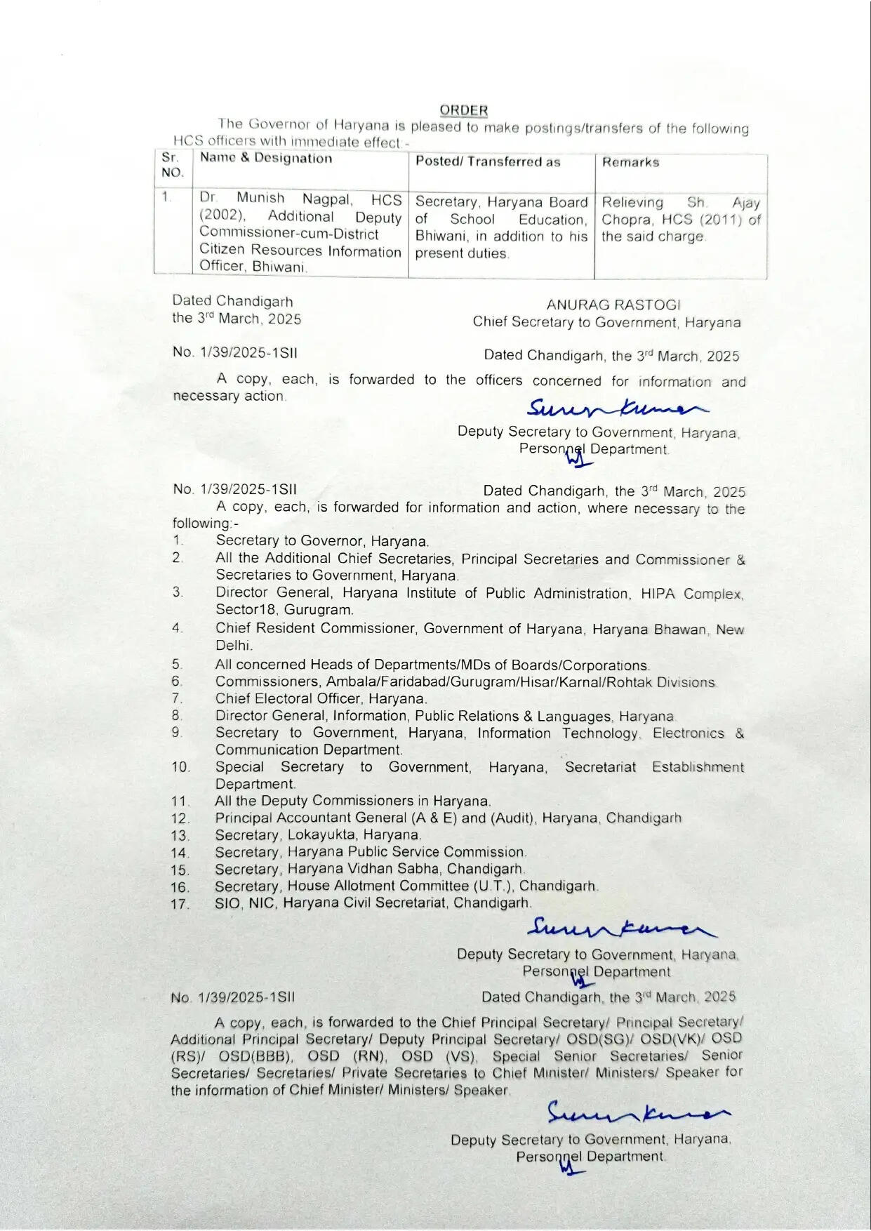 Haryana: हरियाणा सरकार ने तुरंत प्रभाव से डॉ. मुनीष नागपाल को हरियाणा विद्यालय शिक्षा बोर्ड भिवानी का सचिव नियुक्त किया।