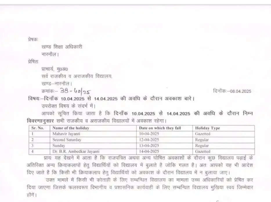 मिली जानकारी के अनुसार, ऐसे में शिक्षा विभाग की तरफ से सभी स्कूलों को आदेश जारी किया गया है कि इन छुट्टियों के दौरान छात्रों को किसी भी प्रकार के कार्यकलापों के लिए स्कूल बुलाते हैं तो कड़ी कार्रवाई होगी।