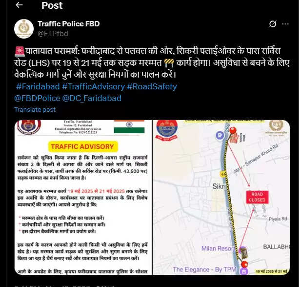 मिली जानकारी के अनुसार, ट्रैफिक पुलिस की ओर से जारी एडवाइजरी के अनुसार नेशनल हाईवे की बल्लभगढ़ से पलवल जाने वाली सर्विस लेन सीकरी के पास 3 दिन तक मरम्म कार्य किया जाएगा।
