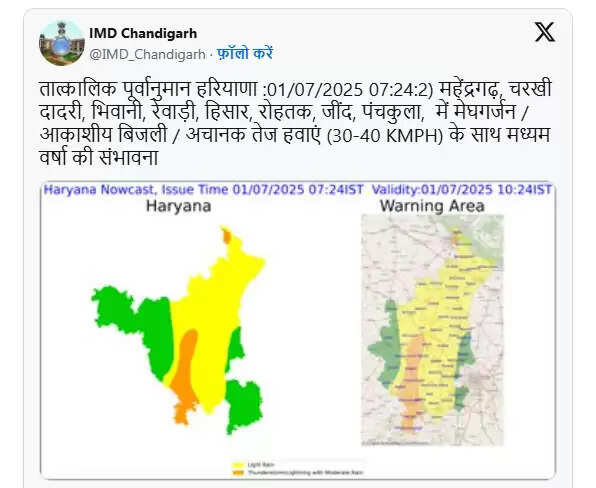 मौसम विभाग के अनुसार, आज यानी मंगलवार को एक महीने बाद स्कूल खुलेंगे. सुबह पानीपत, सोनीपत, झज्जर, जींद में बारिश हुई. अंबाला और करनाल में बादल छाए हुए हैं. यहां बारिश की संभावना है. अगले तीन दिनों तक राज्य में बारिश की चेतावनी दी गई है. महेंद्रगढ़, चरखी दादरी, भिवानी, रेवाड़ी, हिसार, रोहतक, जींद, पंचकुला, में मेघगर्जन-आकाशीय बिजली और अचानक तेज हवाओं (30-40 KMPH) के साथ मध्यम वर्षा की संभावना है.Haryana Weather Update