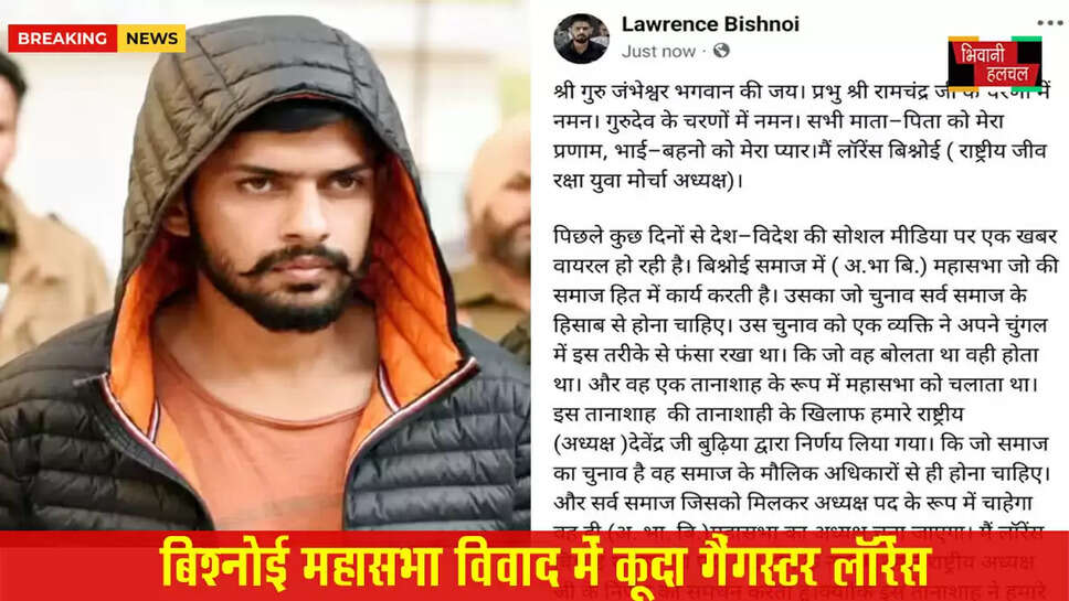 अखिल भारतीय बिश्नोई महासभा के विवाद में अब गैंगस्टर लॉरेंस भी कूद गया है। अध्यक्ष देवेंद्र बूड़िया के समर्थन में लॉरेंस की सोशल मीडिया पोस्ट सामने आई है, जिसमें उसने भाजपा नेता व पूर्व सांसद कुलदीप बिश्नोई का नाम लिए बिना अंजाम भुगतने की धमकी दी है।