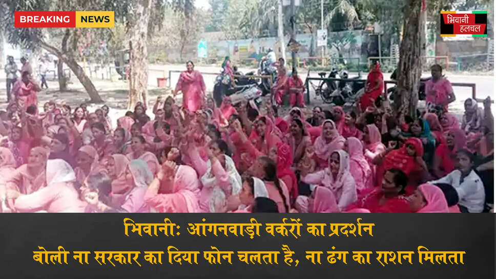 भिवानी में आंगनवाड़ी वर्करों का प्रदर्शन:बोली- ना सरकार का दिया फोन चलता है और ना ढंग का राशन मिलता है