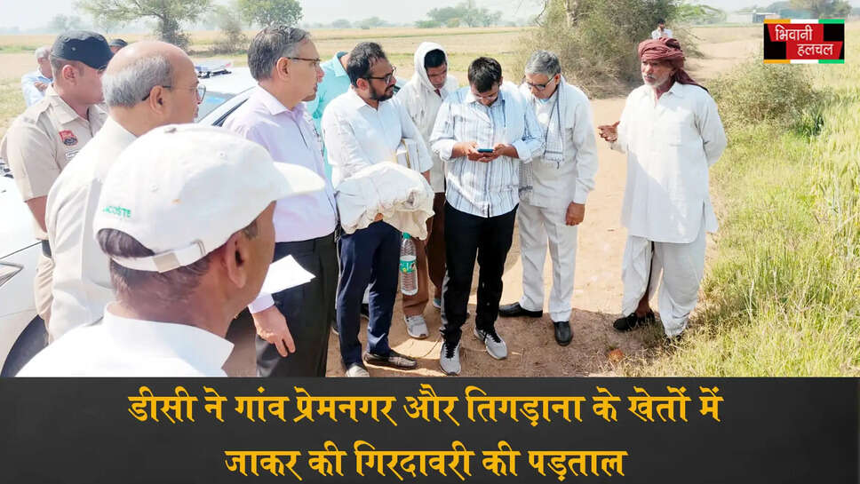 डीसी महावीर कौशिक मंगलवार को गांव प्रेम नगर और तिगड़ाना के खेतों में पहुंचे। उन्होंने राजस्व विभाग के अधिकारियों के साथ गिरदावरी की पड़ताल की। उन्होंने तहसीलदार सुरेश कुमार और कानूनगो मंगल राठी, पटवारी राकेश व संजीत सिंह से पूरी जानकारी ली।