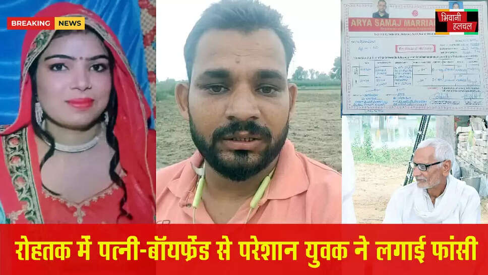 रोहतक में एक युवक ने अपनी पत्नी और उसके बॉयफ्रेंड से परेशान होकर सुसाइड कर लिया। परिजनों को उसका शव पेड़ पर लटका मिला। सुसाइड से पहले युवक ने सोशल मीडिया पर एक वीडियो जारी किया था, जिसमें उसने अपनी पत्नी और उसके बॉयफ्रेंड की पूरी कहानी बताई।