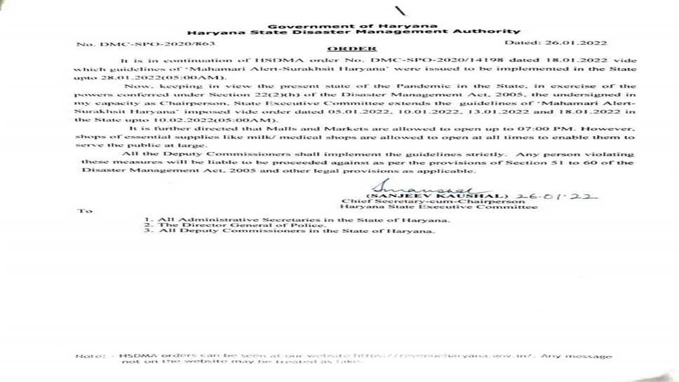 हरियाणा में अब शाम 7 बजे तक खुलेंगी दुकानें:'महामारी अलर्ट सुरक्षित हरियाणा' को 10 फरवरी तक बढ़ाया